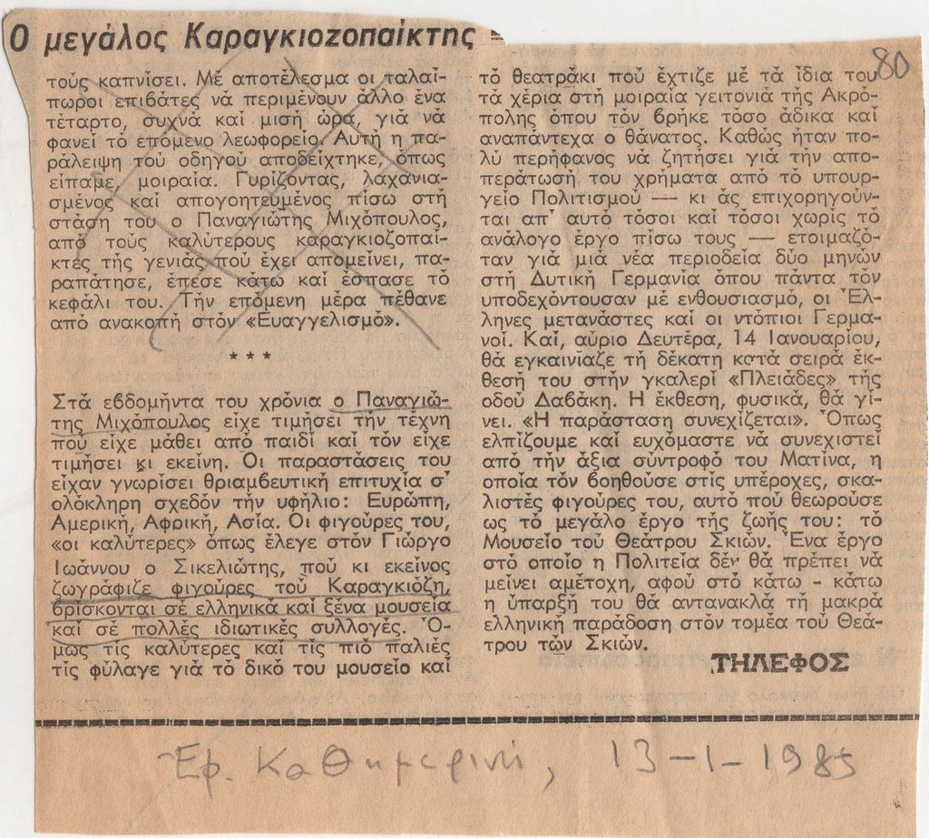 Απόκομμα, χαρτί, 12,5×13,5 εκ., στα ελληνικά, δημοσίευσης άρθρου για τον καραγκιοζοπαίχτη Παναγιώτη Μιχόπουλο. Γίνεται λόγος για τις φιγούρες του, την προσπάθειά του για την ίδρυση Μουσείου Καραγκιόζη και την έκθεση φιγούρων του στην γκαλερί Πλειάδες στην Αθήνα.