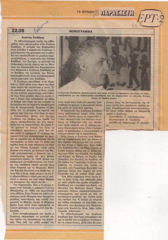 Απόκομμα, χαρτί ακανόνιστου μεγέθους, στα ελληνικά, δημοσίευσης άρθρου αφιερωμένου στον Ευγένιο Σπαθάρη, με αφορμή το αφιέρωμα της εκπομπής “Μονόγραμμα” της ΕΡΤ γι’ αυτόν.