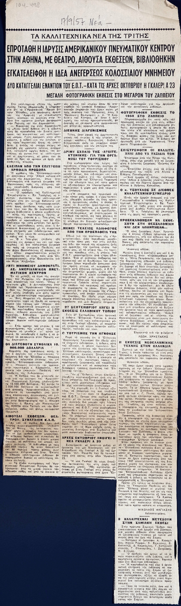 Τα καλλιτεχνικά νέα της Τρίτης : Επροτάθη η ίδρυσις αμερικανικού πνευματικού κέντρου στην Αθήνα, με θέατρο, αίθουσα εκθέσεων, βιβλιοθήκην