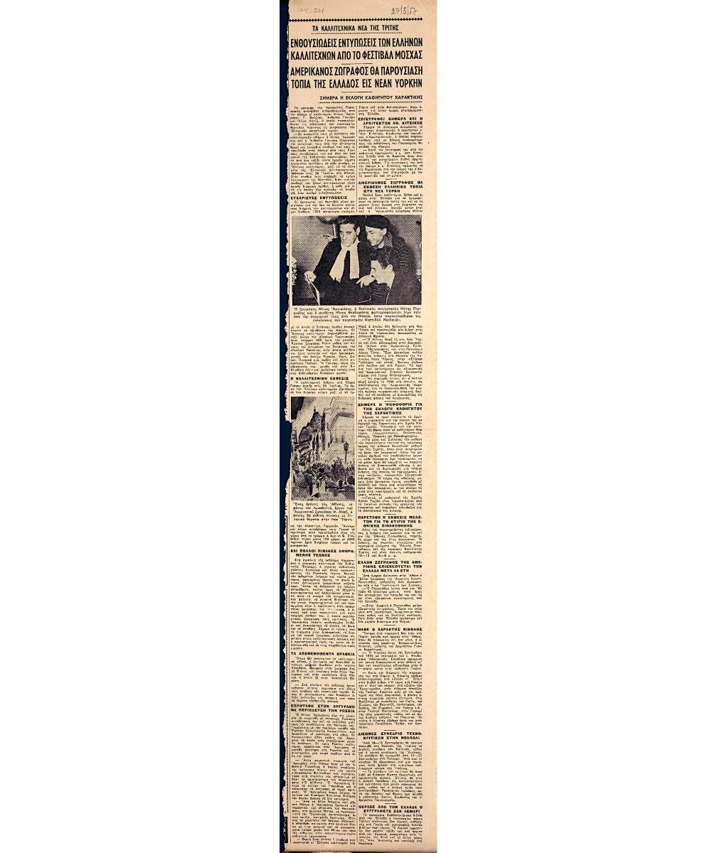 Απόκομμα της εφημερίδας “Τα Νέα” (27/08/1957), όπου δημοσιεύονται ειδήσεις από την καλλιτεχνικής επικαιρότητα της περιόδου.
