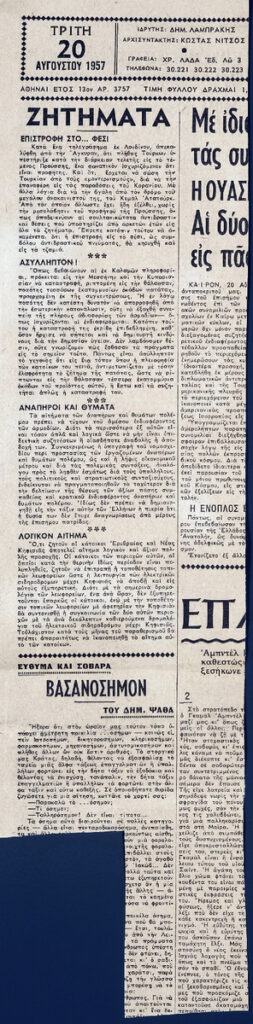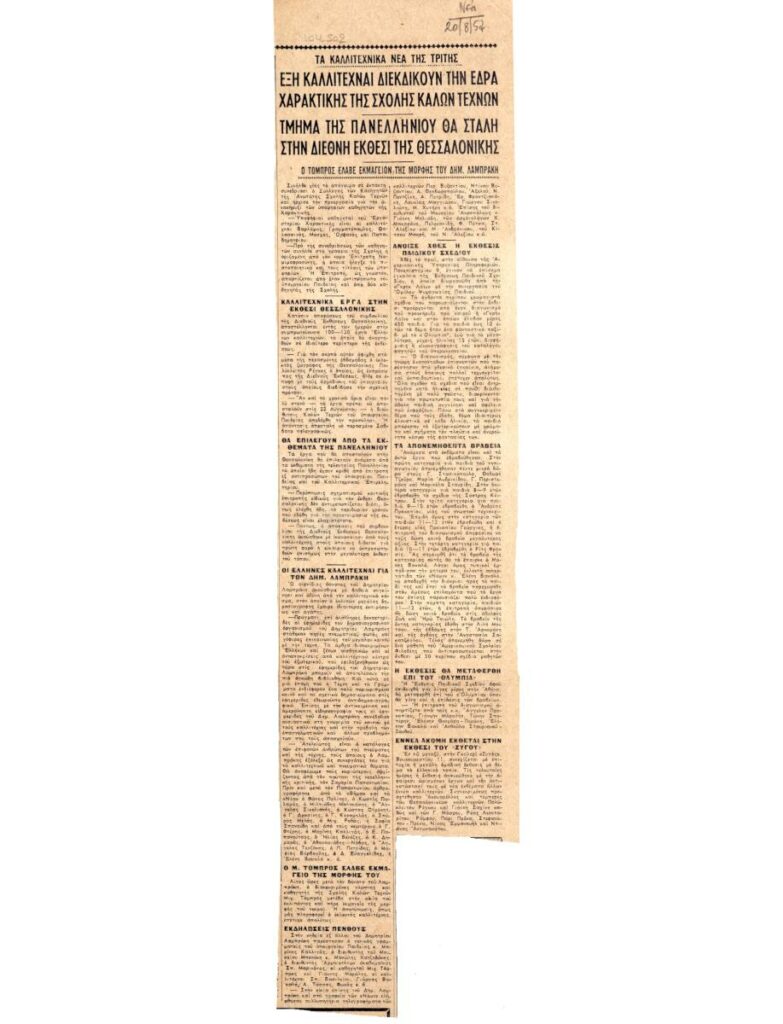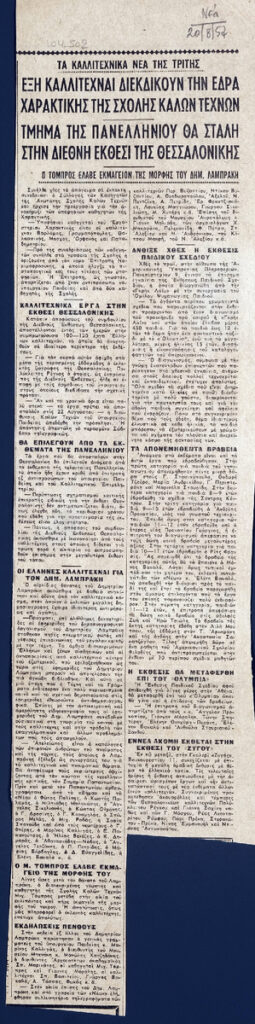 Απόκομμα της εφημερίδας “Τα Νέα” (28/08/1957), όπου δημοσιεύονται ειδήσεις από την καλλιτεχνική επικαιρότητα. Στο ίδιο απόκομμα: “Τμήμα της Πανελληνίου θα σταλή στη διεθνή έκθεσι Θεσσαλονίκης”.