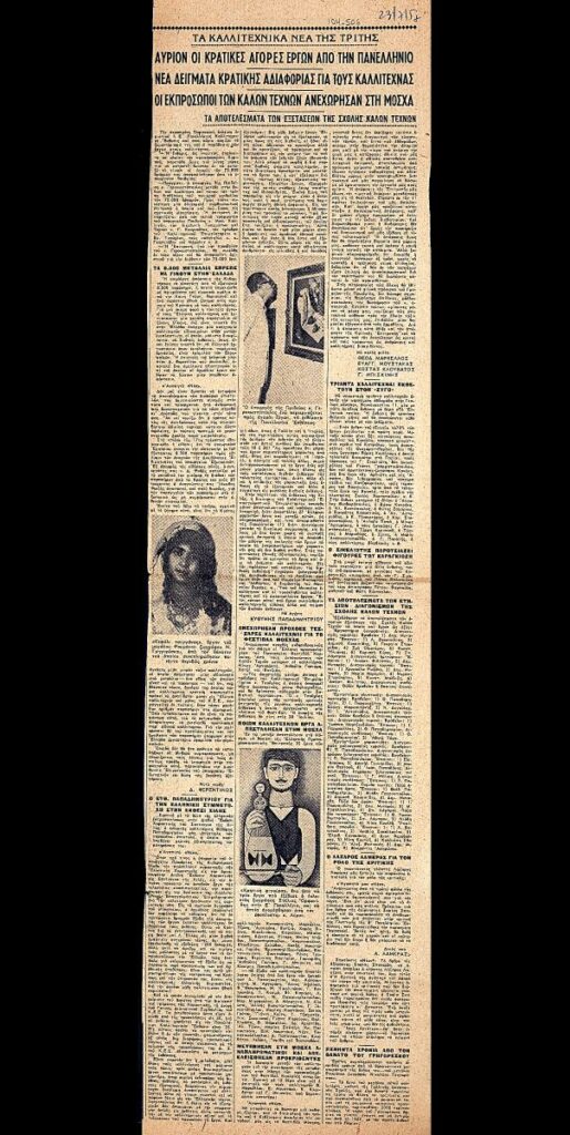 Απόκομμα της εφημερίδας “Τα Νέα” (23/07/1957), όπου δημοσιεύονται ειδήσεις από την καλλιτεχνική επικαιρότητα της εβδομάδας. Πάνω από τον τίτλο, επιγραφή με στοιχεία της έκδοσης. Στο ίδιο απόκομμα: “Νέα δείγματα κρατικής αδιαφορίας για τους καλλιτέχνας”, “Οι εκπρόσωπο των καλών τεχνών ανεχώρησαν στη Μόσχα”.