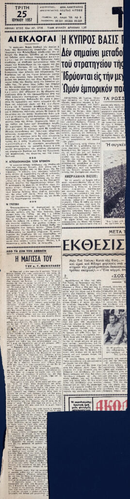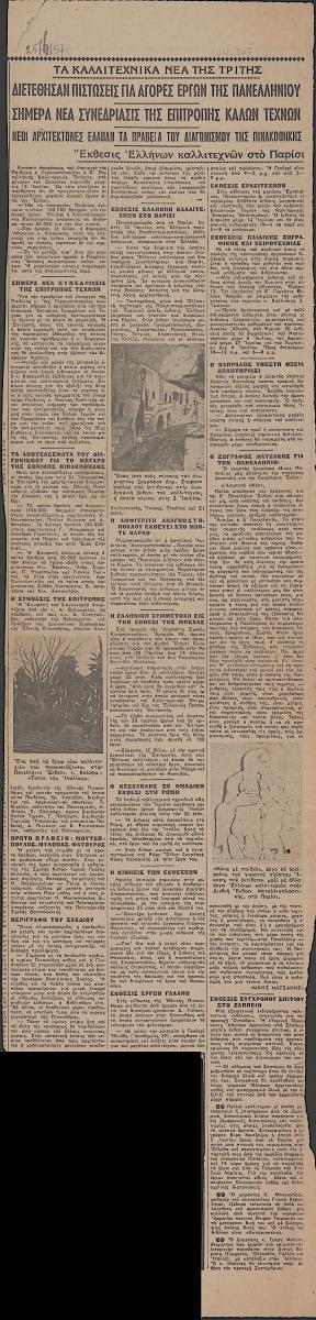 Απόκομμα της εφημερίδας “Τα Νέα” (25/06/1957), όπου δημοσιεύονται ειδήσεις από το πολιτιστικό ρεπορτάζ της εβδομάδας. Το τεκμήριο εικονογραφείται. Πάνω από τον τίτλο, επιγραφή με στοιχεία της έκδοσης. Στο ίδιο απόκομμα: “Σήμερα νέα συνεδρίασις της επιτροπής καλών τεχνών”.