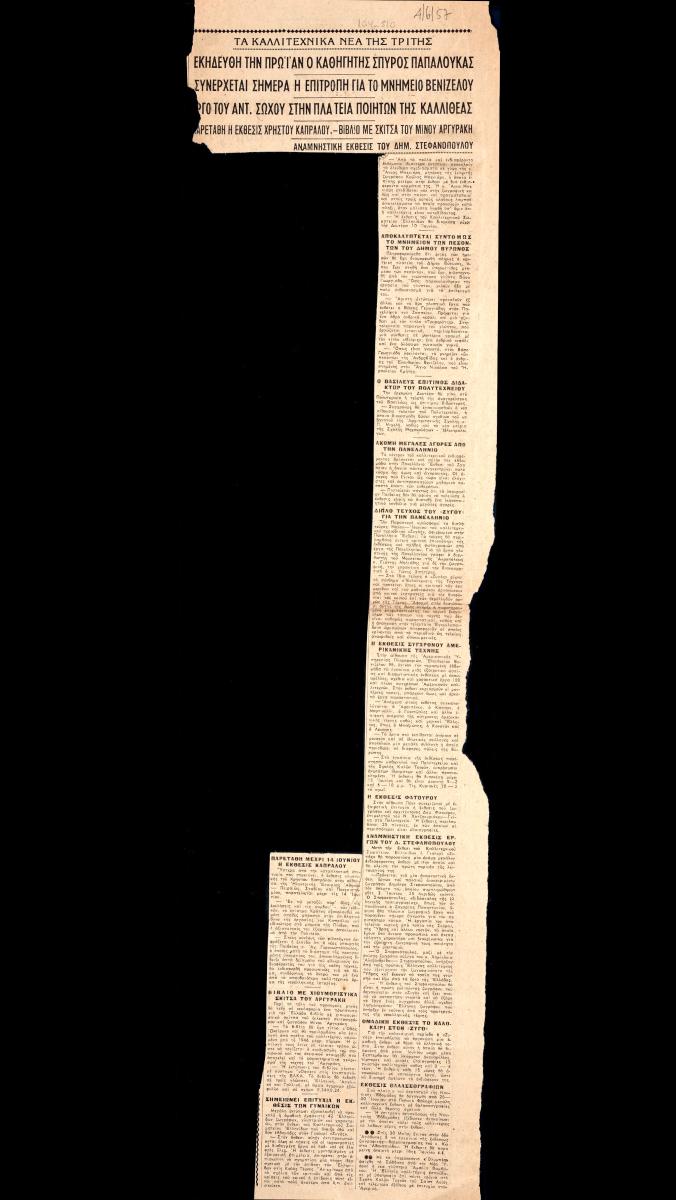 “Συνέρχεται σήμερα η επιτροπή για το μνημείο Βενιζέλου”, “Έργο του Αντ. Σώχου στην πλατεία ποιητών της Καλλιθέας”.