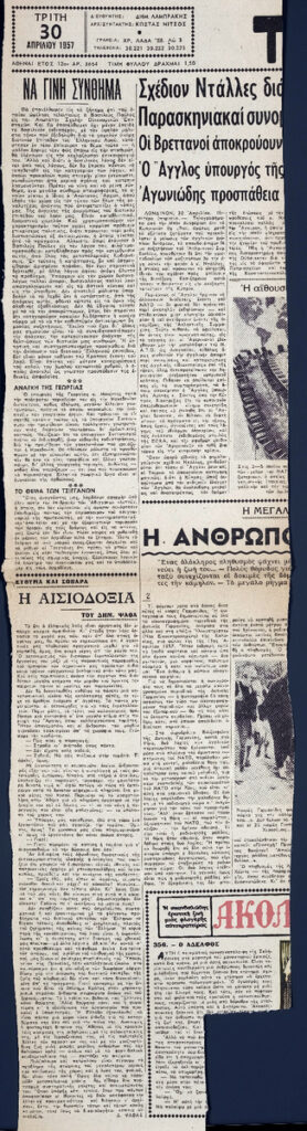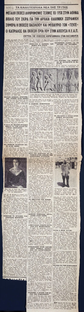 Απόκομμα της εφημερίδας “Τα Νέα” (30/04/1957). Στο ίδιο απόκομμα: “Βιβλίο του Σκίρα για την αρχαία ελληνική ζωγραφική”, “Σήμερα η έκθεσις Βασιλείου και μεθαύριο των “πέντε'”, “Ο Καπράλος θα εκθέση έργα του στην Αίθουσα Η.Ε.Α.Π.”