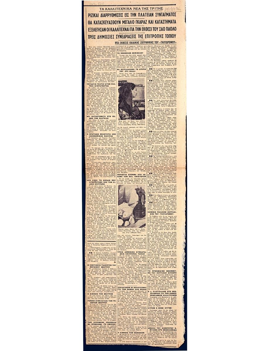 Απόκομμα της εφημερίδας “Τα Νέα” (29/01/1957). Στο ίδιο απόκομμα: “Θα κατασκευασθούν μεγάλο γκαράζ και καταστήματα”, “Ριζικαί διαρρυθμίσεις εις την πλατείαν Συντάγματος”, “3 δημόσιες συνεδριάσεις της επιτροπής τοπίου”.