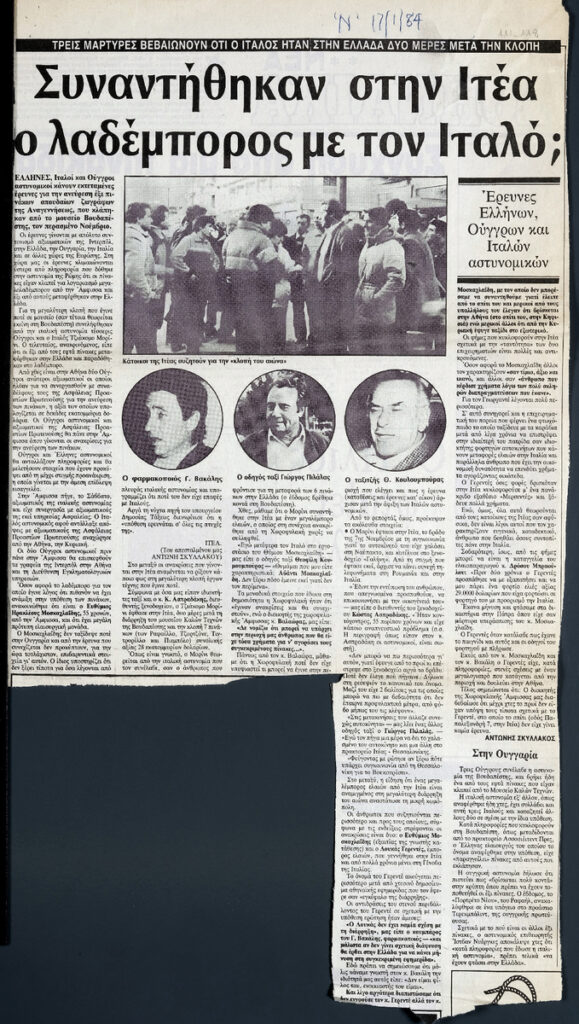 Απόκομμα εφημερίδας (17/01/1984), όπου δημοσιεύεται άρθρο με θέμα την κλοπή έξι έργων τέχνης από το μουσείο της Βουδαπέστης.