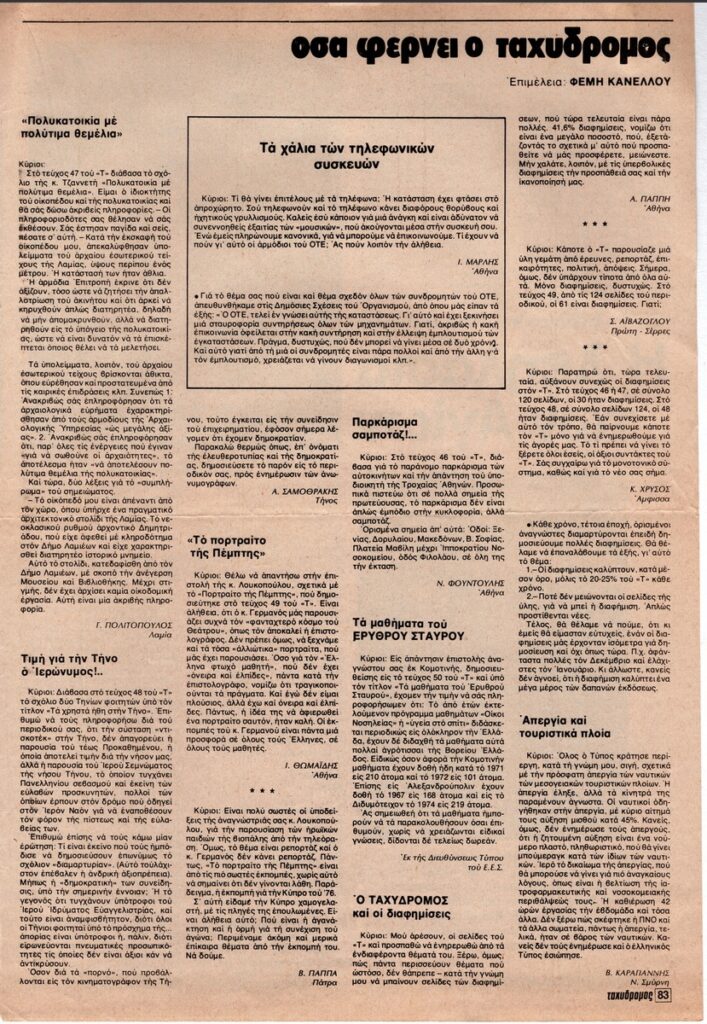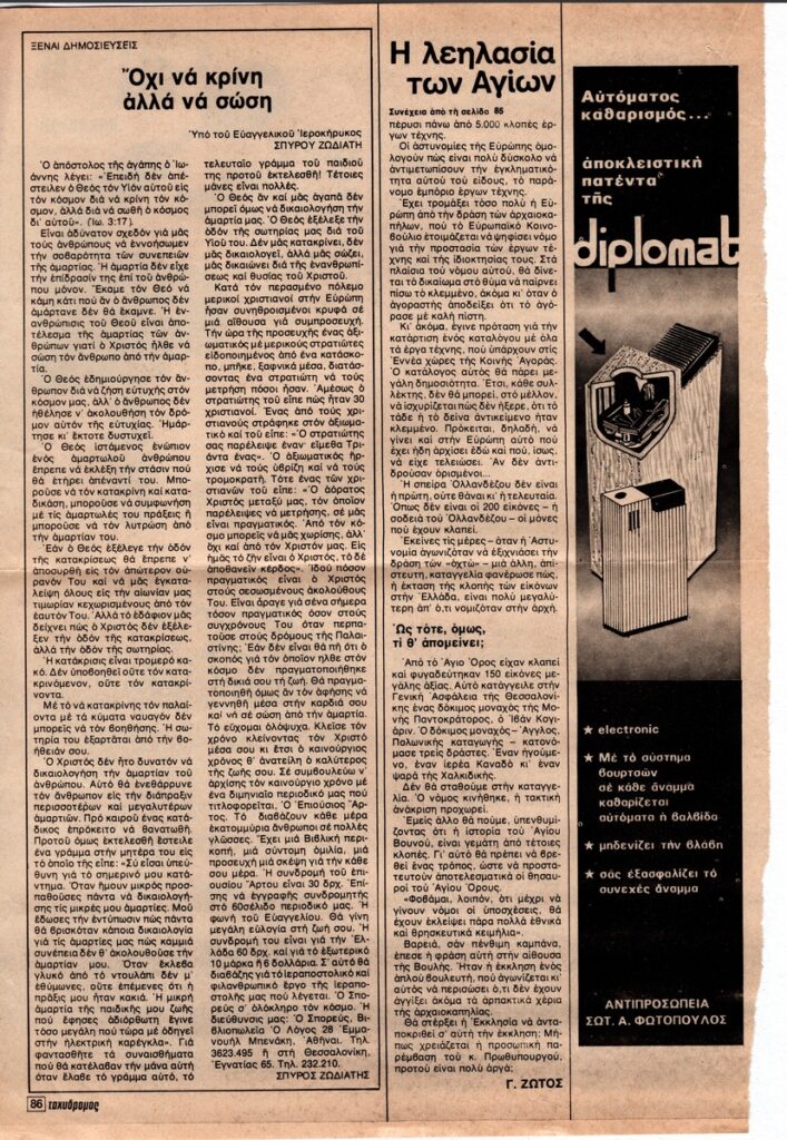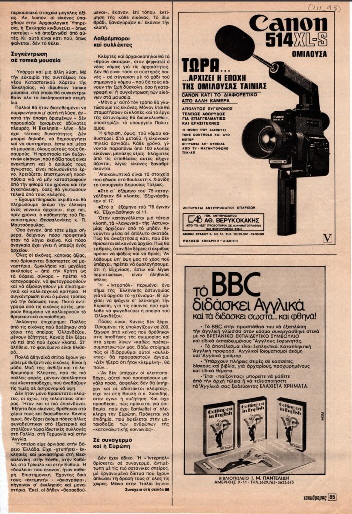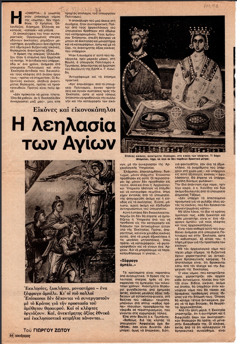 Απόκομμα του περιοδικού “Ο Ταχυδρόμος” (τεύχος 52, 23/12/1976), όπου δημοσιεύεται άρθρο για τις κλοπές βυζαντινών εικόνων.