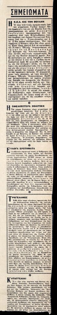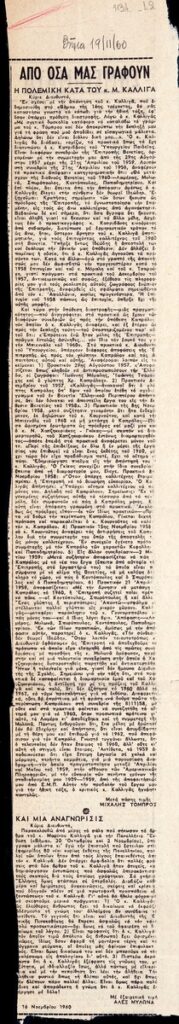 Απόκομμα της εφημερίδας “Το Βήμα” (19/11/1960), όπου δημοσιεύεται κείμενο των γλυπτών Μ. Τόμπρου και Ά. Μυλωνά για τον βυζαντινολόγο Μ. Καλλιγά. Επίσης, γίνεται αναφορά στην Στ΄ Πανελλήνιο Καλλιτεχνική Έκθεση, η οποία έλαβε χώρα στο Ζάππειο Μέγαρο, στην Αθήνα.
