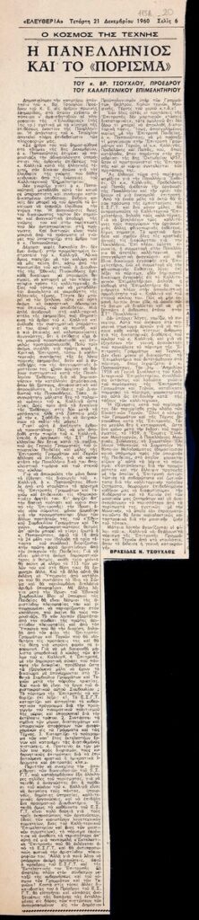 Απόκομμα της εφημερίδας “Ελευθερία” (21/12/1960), όπου δημοσιεύεται άρθρο από τον ζωγράφο Βρασίδα Τσούχλο, αναφορικά με την Στ΄ Πανελλήνιο Καλλιτεχνική Έκθεση, η οποία έλαβε χώρα στο Ζάππειο Μέγαρο, στην Αθήνα.