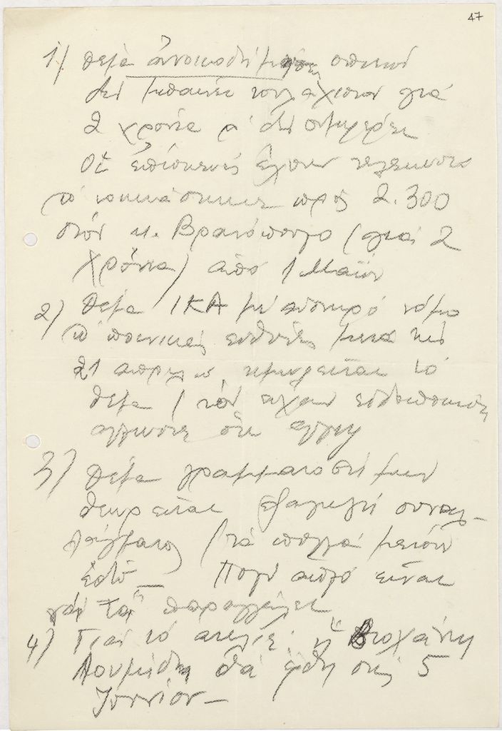 Χειρόγραφες σημειώσεις του Τώνη Σπητέρη, χαρτί, 29×19.5 εκ., στα ελληνικά. Αποτελούν προσχέδιο επιστολής με θέματα για την ενοικίαση ακινήτων στην Αθήνα, οικονομικών και συνταξιοδοτικών ζητημάτων του.