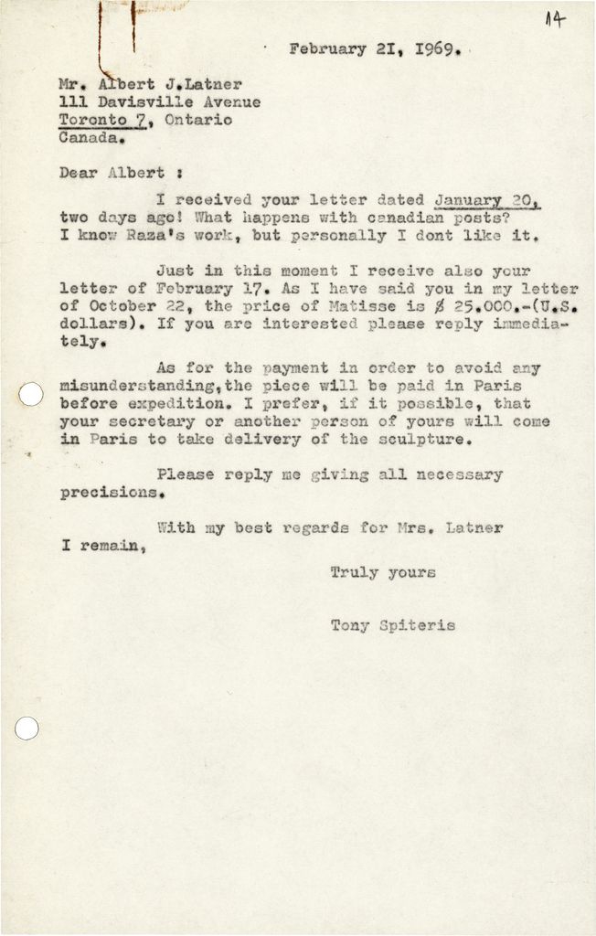 Αναφέρεται στον καλλιτέχνη Raza για τον οποίο ο συλλέκτης ζήτησε πληροφορίες καθώς και σε κοστολόγηση έργου του Matisse.