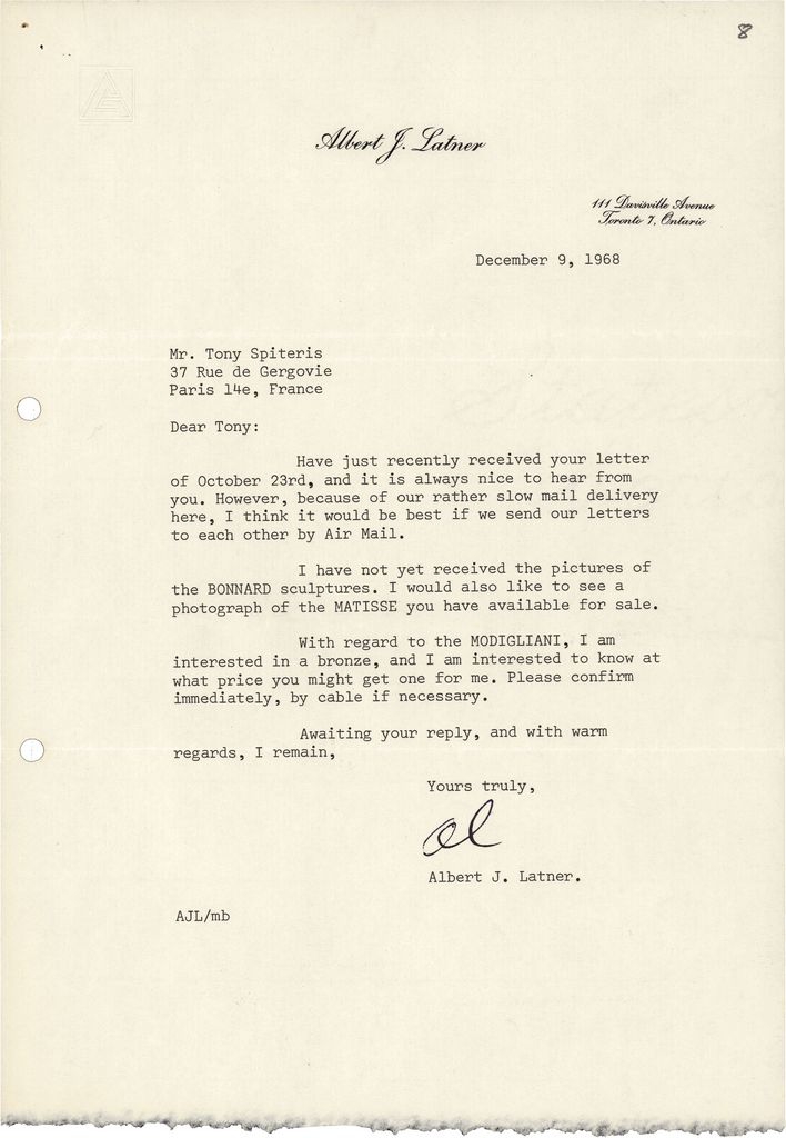 Επιστολή, δακτυλόγραφη, χαρτί, 26.5×18 εκ., στα αγγλικά, απεσταλμένη από τον Albert Latner, προς τον Τώνη Σπητέρη. Αναφέρεται σε έργα καλλιτεχνών που τον ενδιαφέρουν.