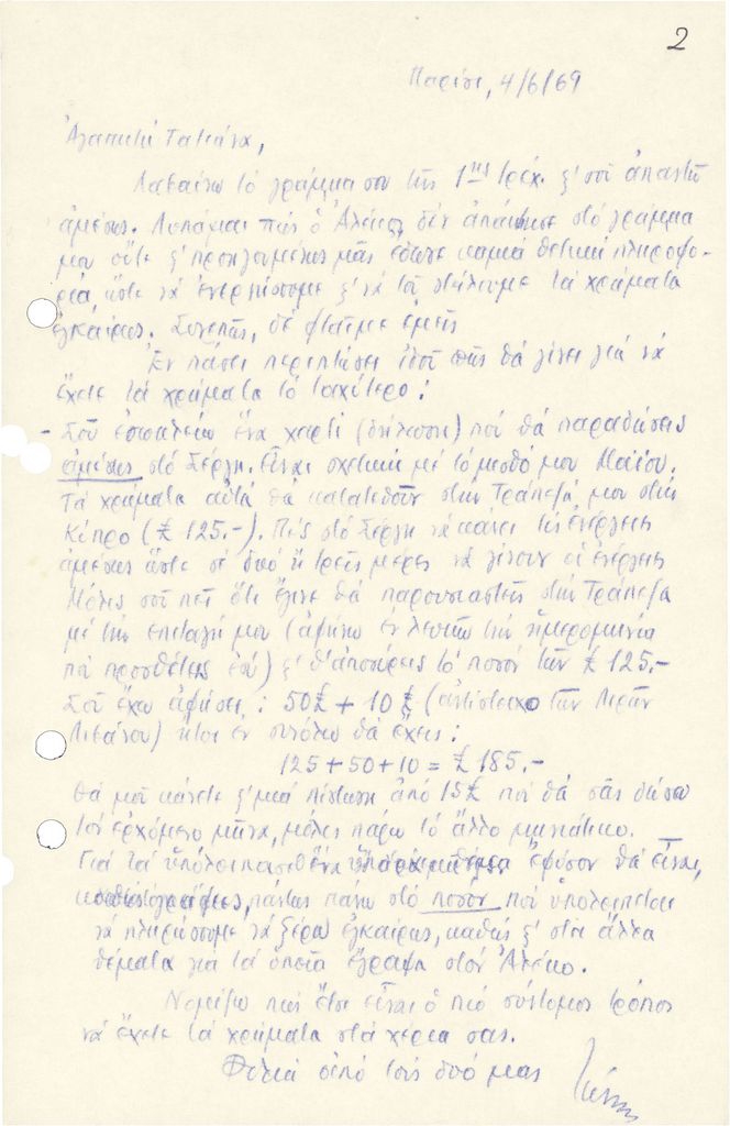 Αντίγραφο χειρόγραφης επιστολής, χαρτί, 21×13.5 εκ., στα ελληνικά, απεσταλμένης από τον Τώνη Σπητέρη προς την Τατιάνα Γκρίτση-Μιλλιέξ. Ο Σπητέρης απαντά σε οικονομικά ζητήματα που προκύπτουν από αγοραπωλησία οικοπέδου.