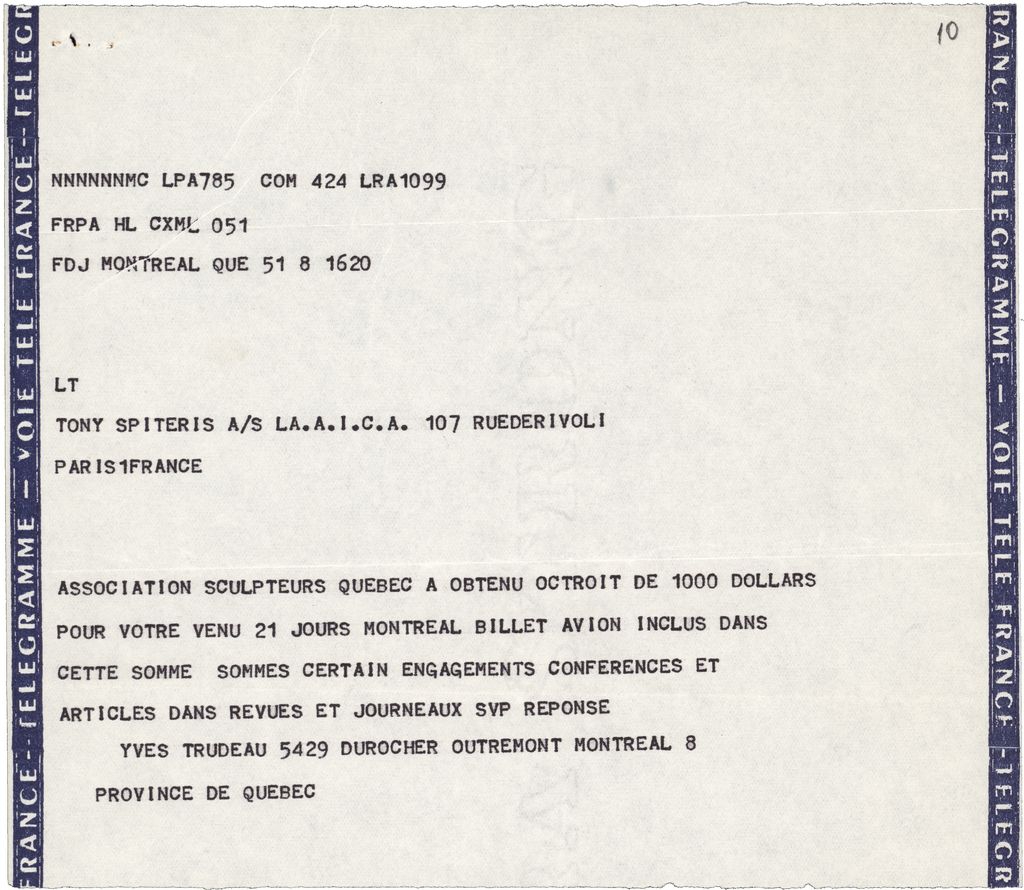 Τηλεγράφημα, χαρτί, 18×21 εκ., στα γαλλικά, απεσταλμένο από τον Yves Trudeau προς τον Τώνη Σπητέρη.