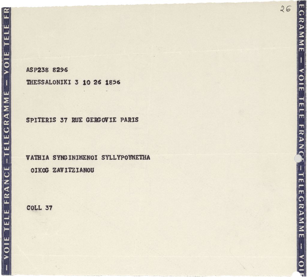 Συλλυπητήριο τηλεγράφημα, χαρτί, 19×21 εκ., της οικογένειας Ζαβιτζιάνου προς τον Τώνη Σπητέρη, για τον θάνατο του πατέρα του.