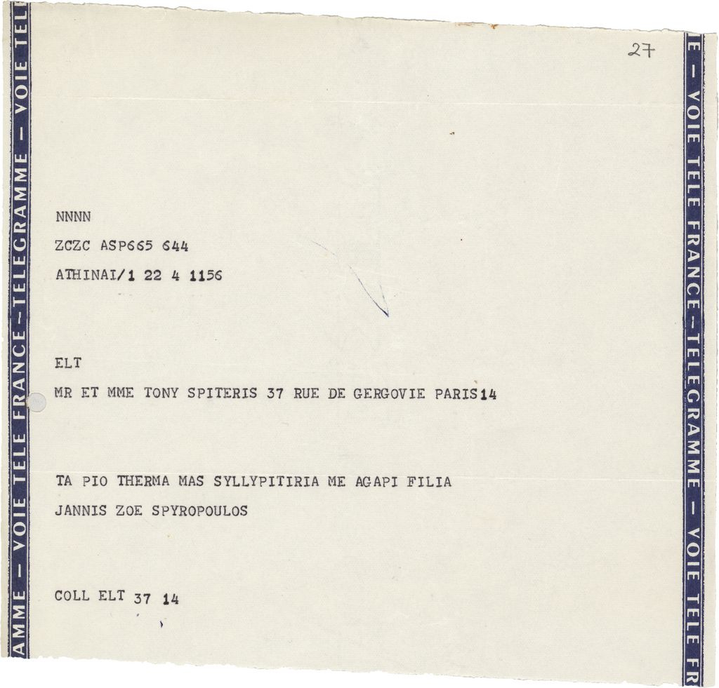 Συλλυπητήριο τηλεγράφημα του ζεύγους Σπυρόπουλου προς τον Τώνη Σπητέρη
