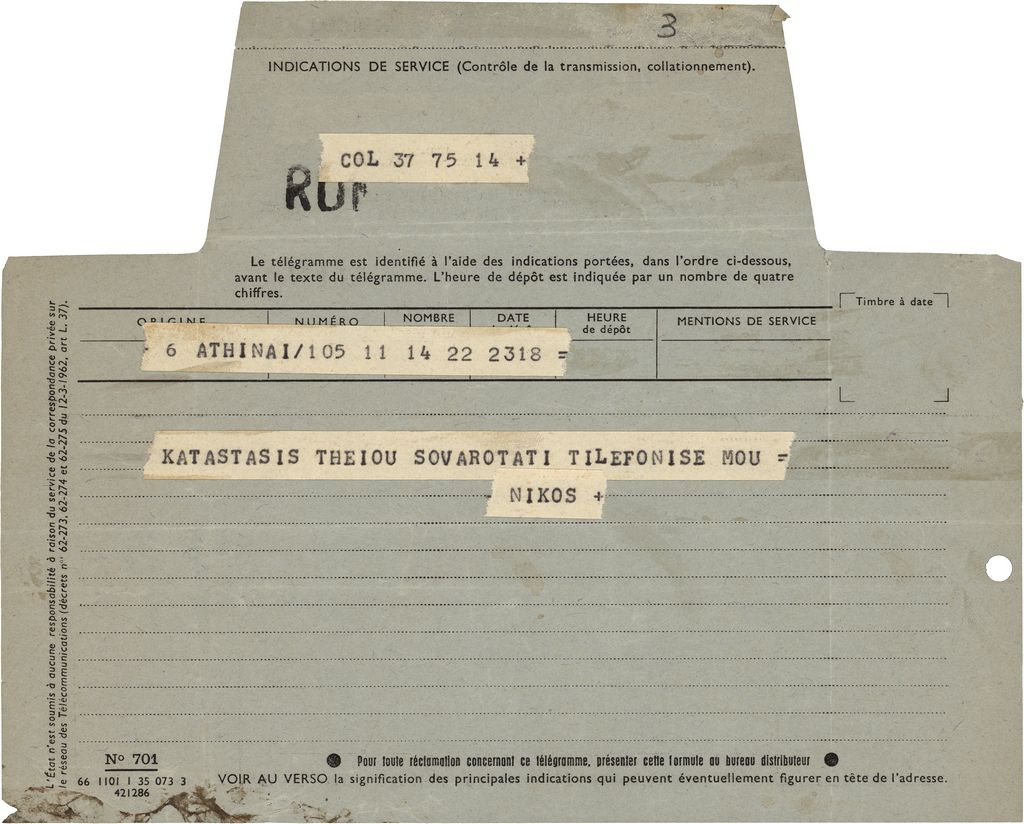 Τηλεγράφημα, χαρτί, 12×21 εκ., στα γαλλικά, απεσταλμένο προς τον Τώνη Σπητέρη, στο οποίο ενημερώνεται για την κατάσταση της υγείας του θείου του ή του πατέρα του.