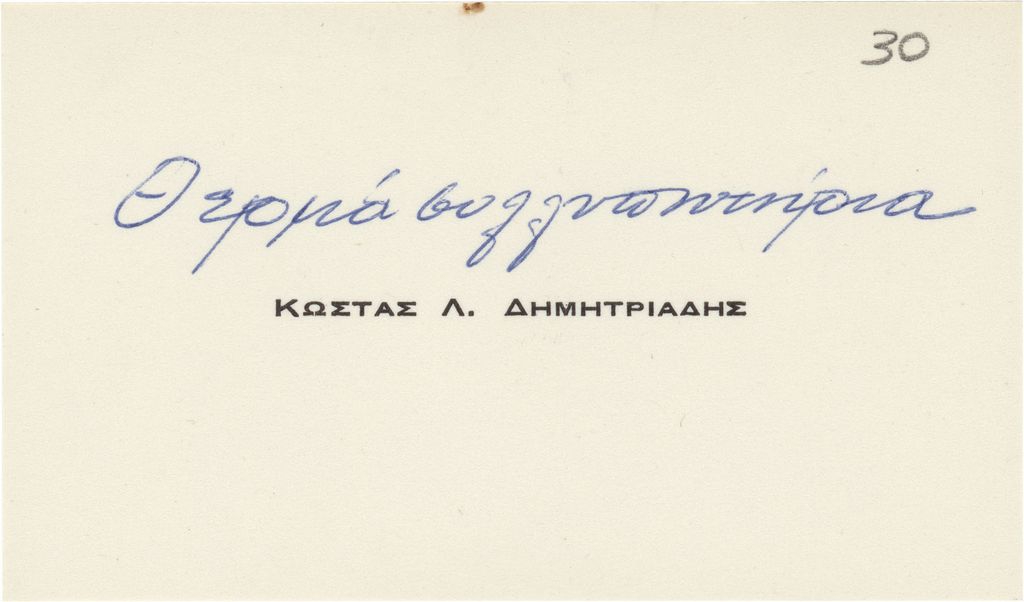 Επαγγελματική κάρτα του Κώστα Δημητριάδη, χαρτόνι, 10×5.5 εκ., στα ελληνικά, απεσταλμένη προς τον Τώνη Σπητέρη. Φέρει χειρόγραφες συλλυπητήριες ευχές για τον θάνατο του πατέρα του.