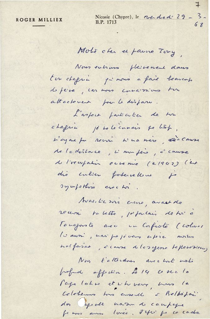 Συλλυπητήρια χειρόγραφη επιστολή, χαρτί διπλής όψης, 23×15 εκ., στα γαλλικά, απεσταλμένη από τον Roger Milliex προς τον Τώνη Σπητέρη για τον θάνατο του πατέρα του.