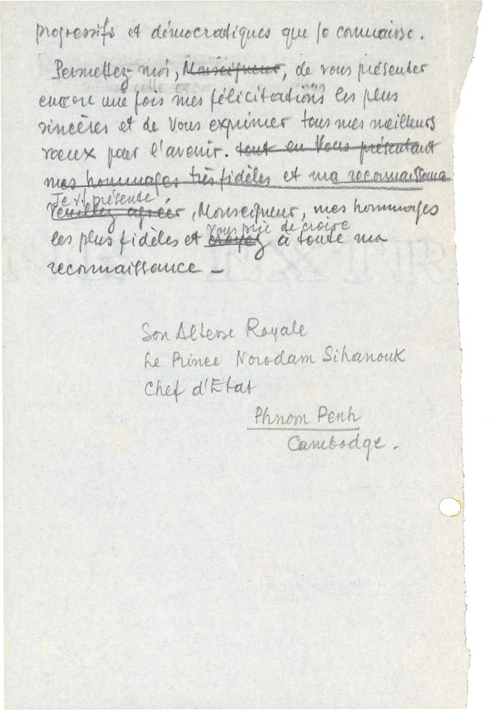 Προσχέδιο χειρόγραφης επιστολής, χαρτί, 21×14 εκ., στα γαλλικά, απεσταλμένης από τον Τώνη Σπητέρη προς τον Norodom Sihanouk, στην οποία τον ευχαριστεί για τη θερμή υποδοχή και περιποίηση που έλαβε κατά τη διαμονή του στην Καμπότζη.