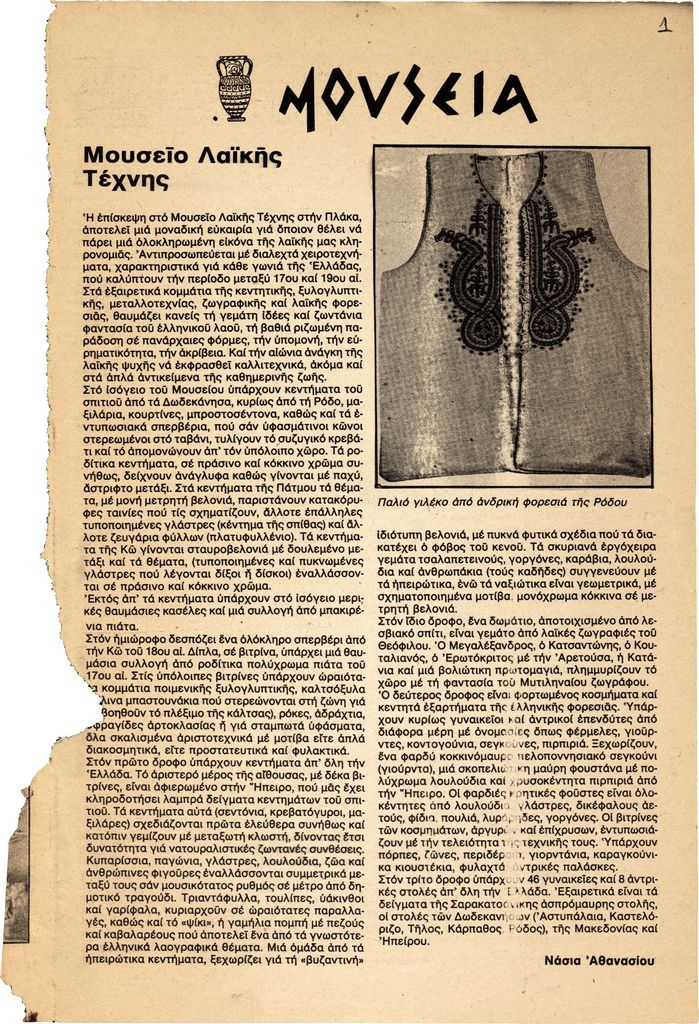 Απόκομμα, χαρτί, 23×15 εκ., στα ελληνικά, δημοσίευσης άρθρου το οποίο περιγράφει εκθέματα και τον χώρο του Μουσείου Λαϊκής Τέχνης της Αθήνας.