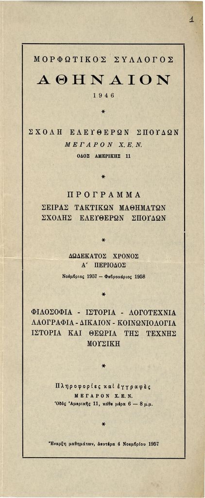Αναγράφεται το πρόγραμμα μαθημάτων του Συλλόγου την περίοδο Νοεμβρίου 1957 με Φεβρουάριο 1958. Πρόκειται για μαθήματα τέχνης, φιλοσοφίας, θεάτρου, ιστορίας, μουσικής από τους Παπανούτσο, Παναγιωτόπουλο, Τερζάκη, Ξυγγόπουλο, Κουρνούτο, Σπητέρη, Παπαϊωάννου.