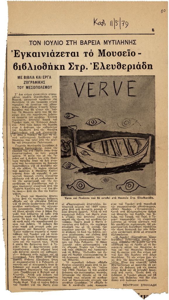 Απόκομμα, χαρτί, 30×17 εκ., στα ελληνικά, δημοσίευσης άρθρου το οποίο αναφέρεται στην εγκαίνια του Μουσείου Στρατή Ελευθεριάδη/Teriade, στη Βαρειά Μυτιλήνης. Δίνονται πληροφορίες για τα έργα που θα φιλοξενεί, ενώ σημειώνεται πως διευθυντής του θα είναι ο Μανώλης Καλλιγιάννης. Ακόμη, δίνονται πληροφορίες για την εκδοτική δραστηριότητα του Τεριάντ, ειδικότερα για την κυκλοφορία του “Verve”.