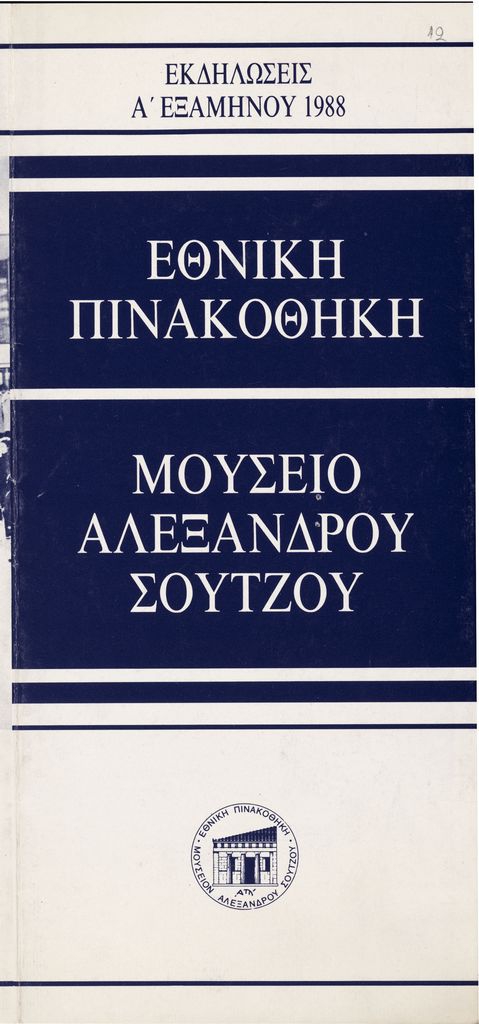 Έντυπο, χαρτόνι τρίπτυχο, 23,5×10,5 εκ., στα ελληνικά, εκδηλώσεων που διεξάγονται στην Εθνική Πινακοθήκη Αθηνών το πρώτο εξάμηνο 1988.
