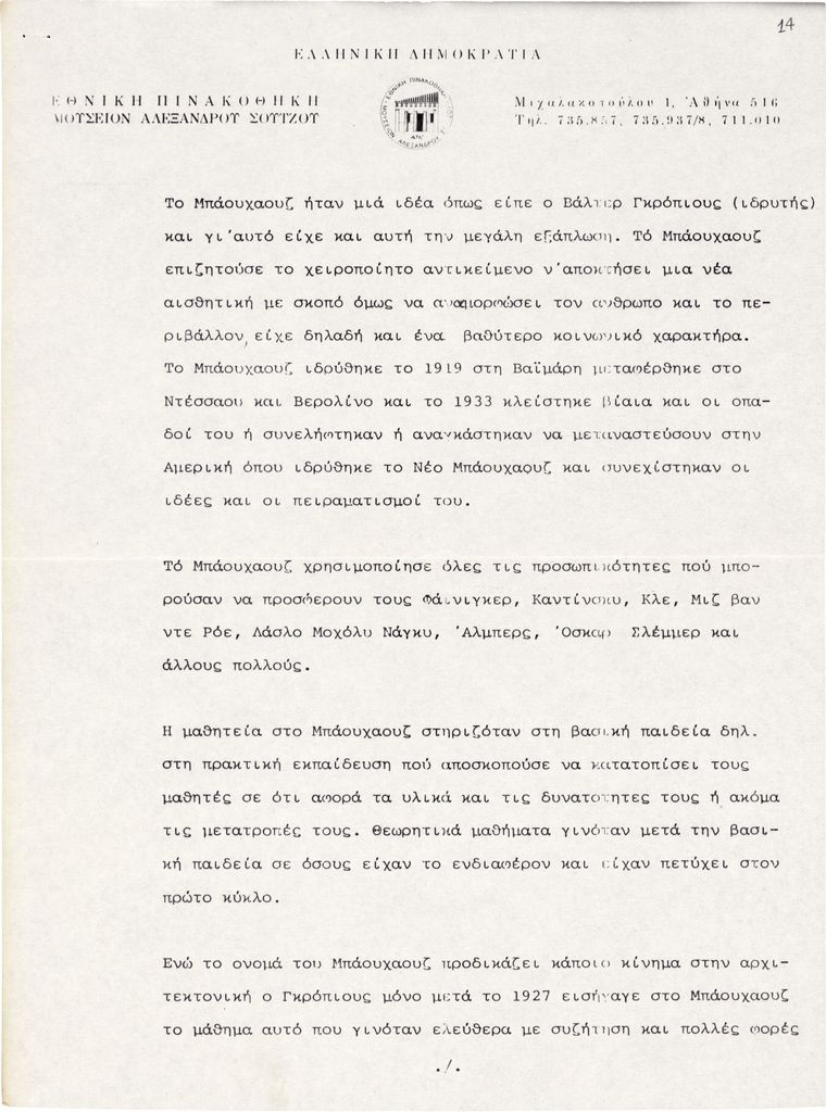 Δακτυλόγραφο κείμενο για το Bauhaus, χαρτί, 3 φφ, 28.5×21 εκ., στα ελληνικά στο πλαίσιο διοργάνωσης σχετικής έκθεσης, στην Εθνική Πινακοθήκη και Μουσείο Αλεξάνδρου Σούτζου στην Αθήνα.