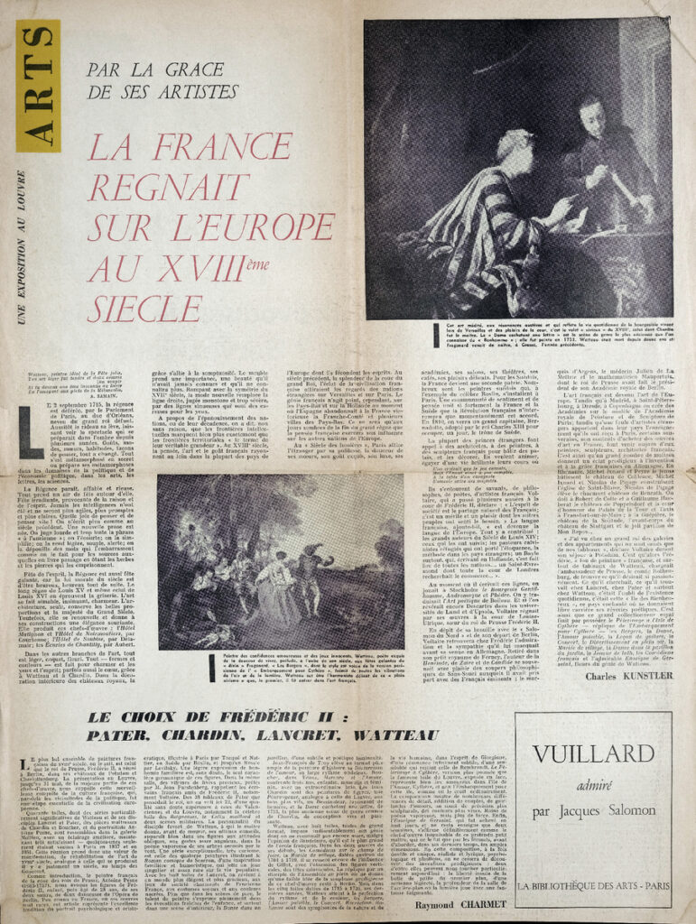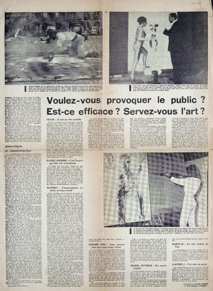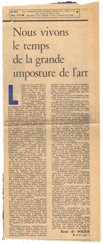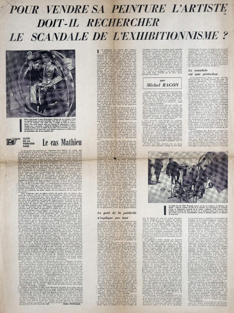 Απόκομμα, έντυπο, στα γαλλικά, χαρτί, 4 όψεις. Στο ίδιο απόκομμα: “Pour vendre sa peinture l’artiste doit-il rechercher le scandale de l’exhibitionnisme”, “Voulez-vous provoquer le public Est-ce efficace Servez-vous l’arte”, “Par la grace de ses artistes”, “La France regnait sur l’Europe au XVIIéme siécle”, “Une exposition au Louvre”, “Munich : 50 artistes, 200 oeuvres un panorama de lart français contemporain”.