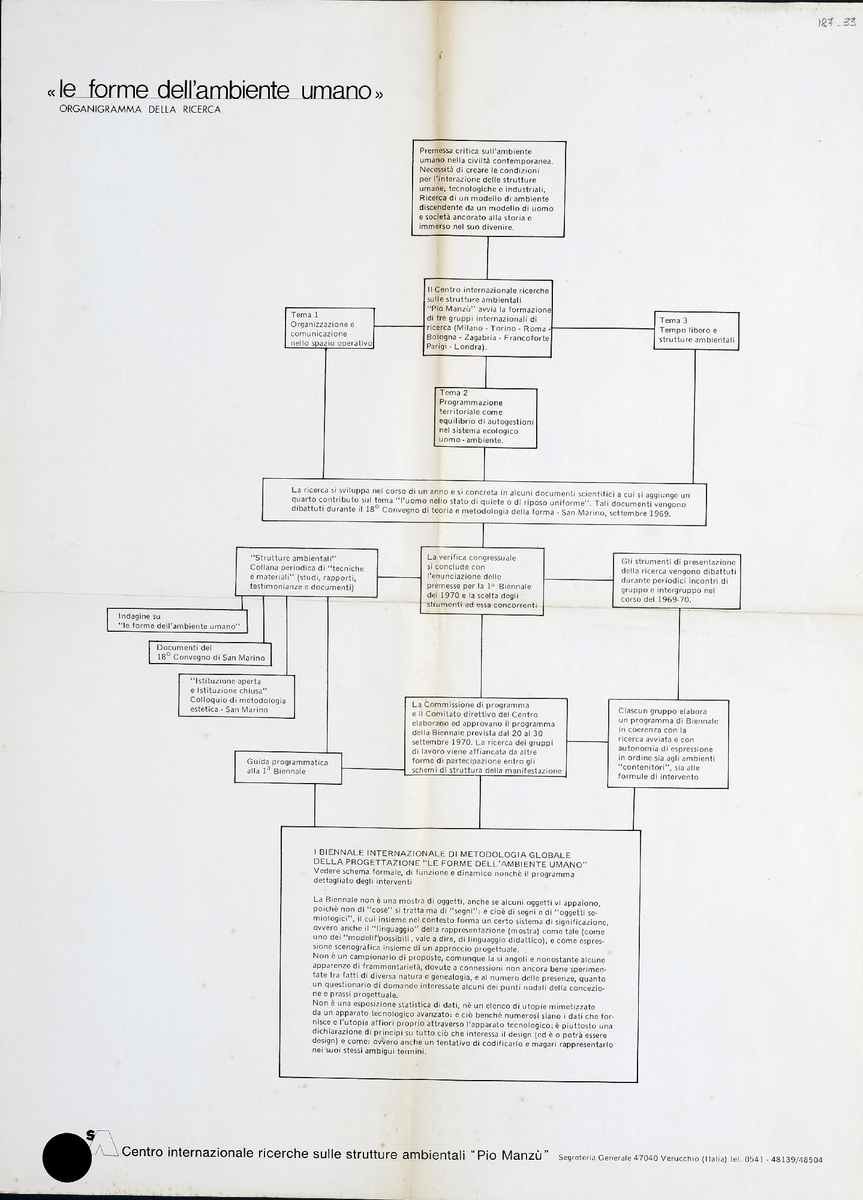 Έντυπο, μονόφυλλο, στα ιταλικά, χαρτί, μία όψη, 45×33 εκ. Οργανωτικό διάγραμμα από το Centro Internazionale Ricerche sulle Stutture Ambientali Pio Manzù, για την 1a Biennale Internazionale di Metodologia Globale della progettazione με τον τίτλο “Le Forme dell’ambiente umano”, στο Rimini της Ιταλίας.