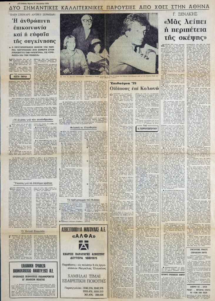 Απόκομμα της εφημερίδας “Το Βήμα” (21/08/1975). Στο ίδιο απόκομμα: Κ. Γεωργουσόπουλος “Επιδαύρια 75. Οιδίπους επί Κολωνώ. Γ. Ξενάκης: Μας λείπει η περιπέτεια της σκέψης”.