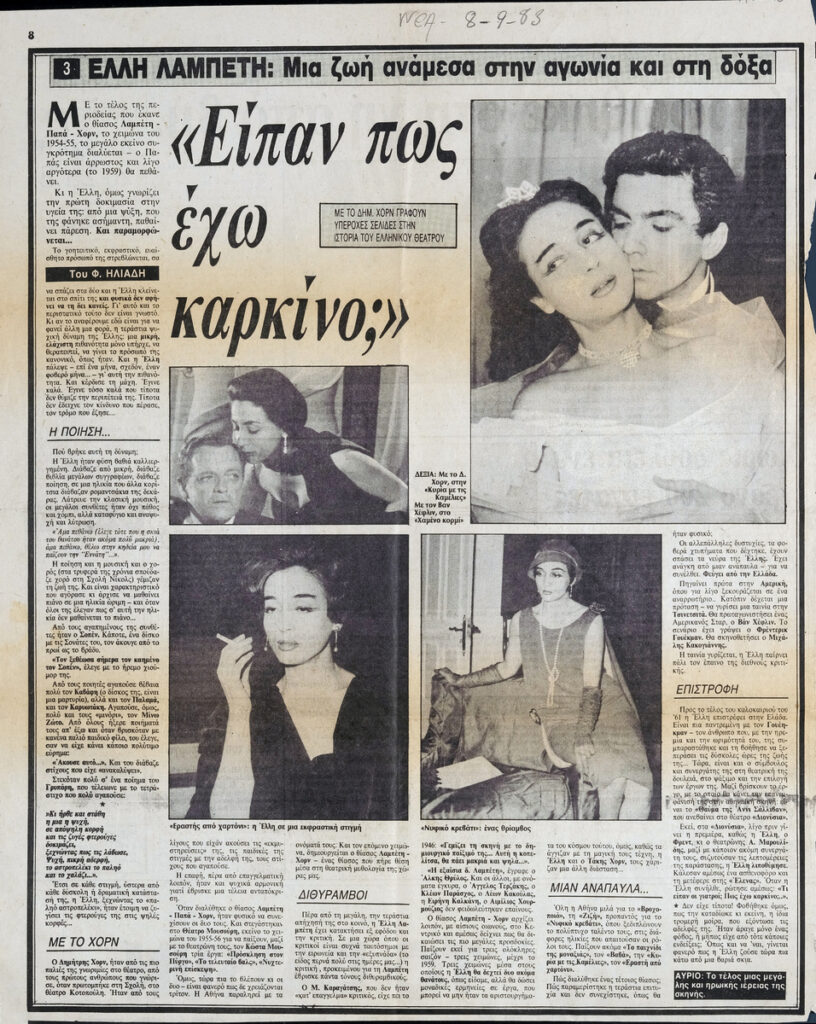 Απόκομμα της εφημερίδας “Τα Νέα” (08/09/1983), όπου δημοσιεύεται άρθρο του κριτικού κινηματογράφου Φ. Ηλιάδη, αναφορικά με την ηθοποιό Έ. Λαμπέτη.