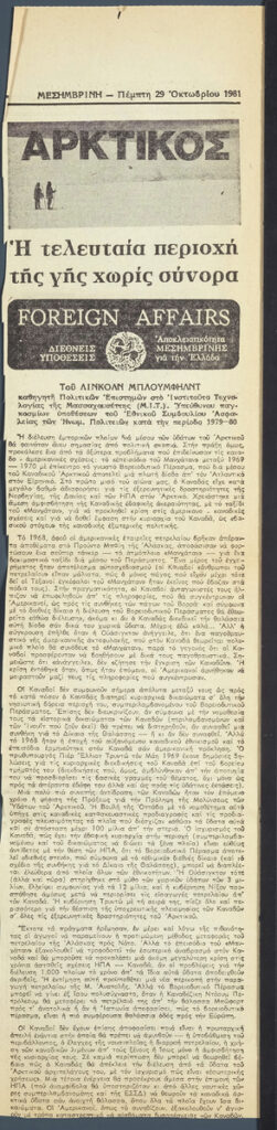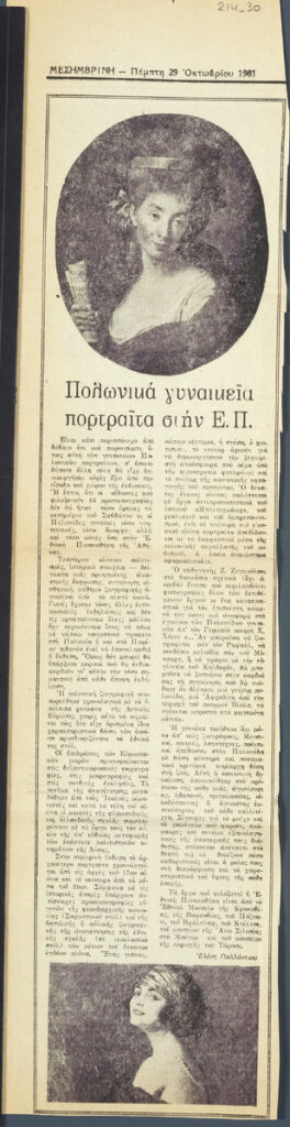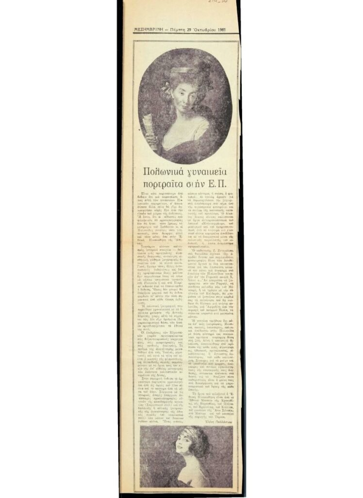 Απόκομμα της εφημερίδας “Μεσημβρινή” (29/10/1981), όπου δημοσιεύεται άρθρο σχετικά με την έκθεση γυναικείων πορτρέτων Πολωνών καλλιτεχνών στην Εθνική Πινακοθήκη στην Αθήνα.