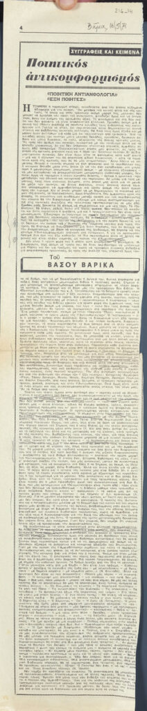 Απόκομμα από την εφημερίδα “Το Βήμα” (16/05/1971).