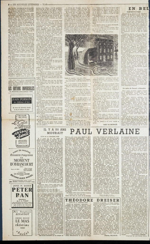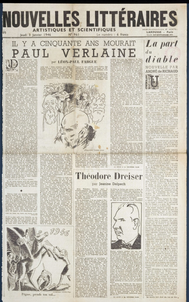 Απόκομμα της εφημερίδας “Les Nouvelles Litteraires”, στα γαλλικά, χαρτί, δύο όψεις. Στο ίδιο απόκομμα: “Théodore Dreiser”.