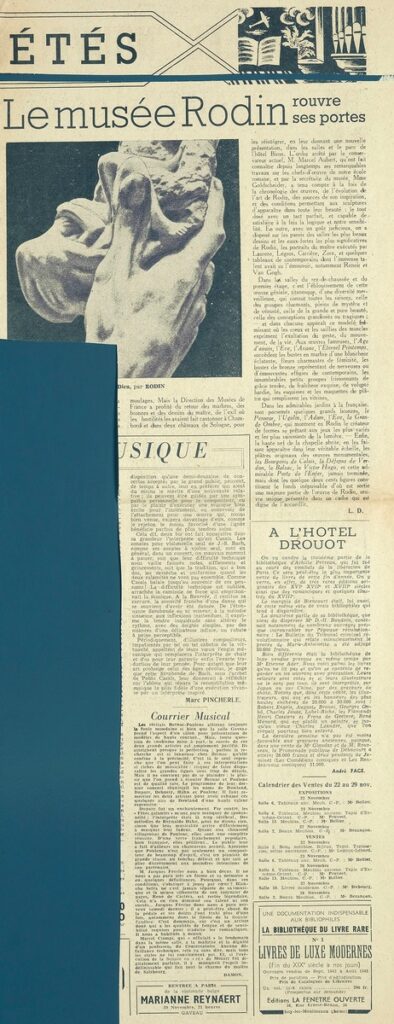 Απόκομμα της εφημερίδας “Les Nouvelles Litteraires”, στα γαλλικά, χαρτί, δύο όψεις. Στο ίδιο απόκομμα: “Le musée Rodin rouvre ses portes”.