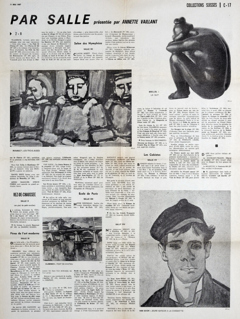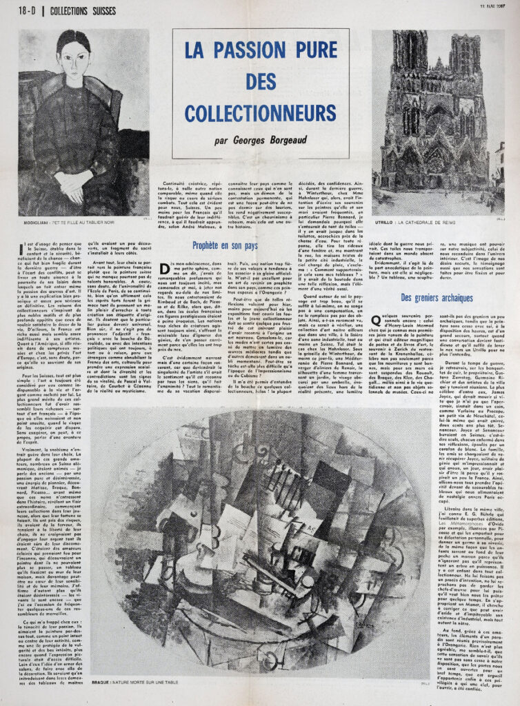 Απόκομμα της εφημερίδας “Les Nouvelles Littéraires”, έντυπο, στα γαλλικά, χαρτί, δίφυλλο διπλής όψης, 58×42,5 εκ. Το απόσπασμα εικονογραφείται. Στο ίδιο απόκομμα: F. Daulte “La continuité d’ un gout”, G. Borgeaud “La passion pure des collectionneurs”.