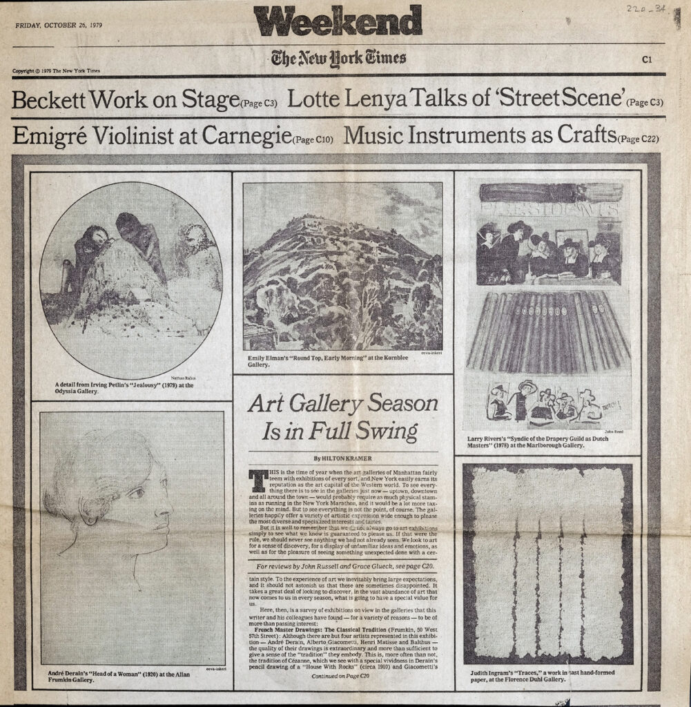Απόκομμα της εφημερίδας “The New York Times”, έντυπο, στα αγγλικά, χαρτί, διπλής όψης, 38×36,5 εκ., όπου δημοσιεύεται άρθρο του Αμερικανού ιστορικού και κριτικού της τέχνης H. Kramer, σχετικά με τις νέες εθέσεις στις γκαλερί τέχνης. Το απόσπασμα εικονογραφείται.