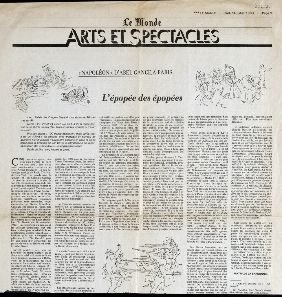 Απόκομμα της εφημερίδας “Le Monde”, 30/10-06/11/1963, έντυπο, στα γαλλικά, χαρτί, διπλής όψης, 60×42 εκ., όπου δημοσιεύεται άρθρο της Mathilde la Bardonnie, σχετικά με την κινηματογραφική παραγωγή “Napoléon” του 1927, σε σκηνοθεσία Abel Gance. Το απόσπασμα εικονογραφείται. Στο ίδιο απόκομμα: H. Guibert “Topographie d’ un enseignement général”.