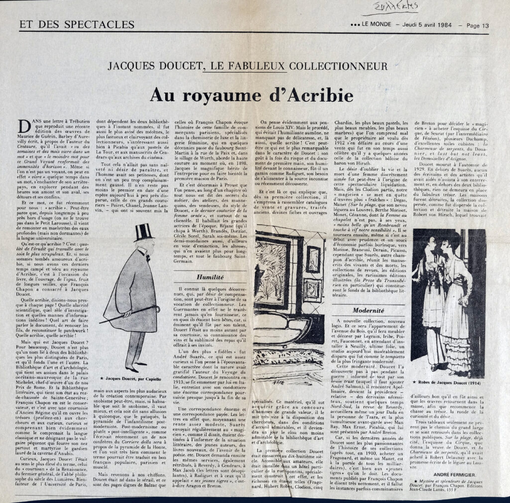 Απόκομμα της εφημερίδας “Le Monde”, έντυπο, στα γαλλικά, χαρτί, διπλής όψης, 33×33 εκ., όπου δημοσιεύεται άρθρο του ιστορικού και κριτικού της τέχνης A. Fermigier, σχετικά με τον συλλέκτη και σχεδιαστή μόδας J. Doucet. Το απόσπασμα εικονογραφείται. Πάνω δεξιά, επιγραφή, στα ελληνικά.