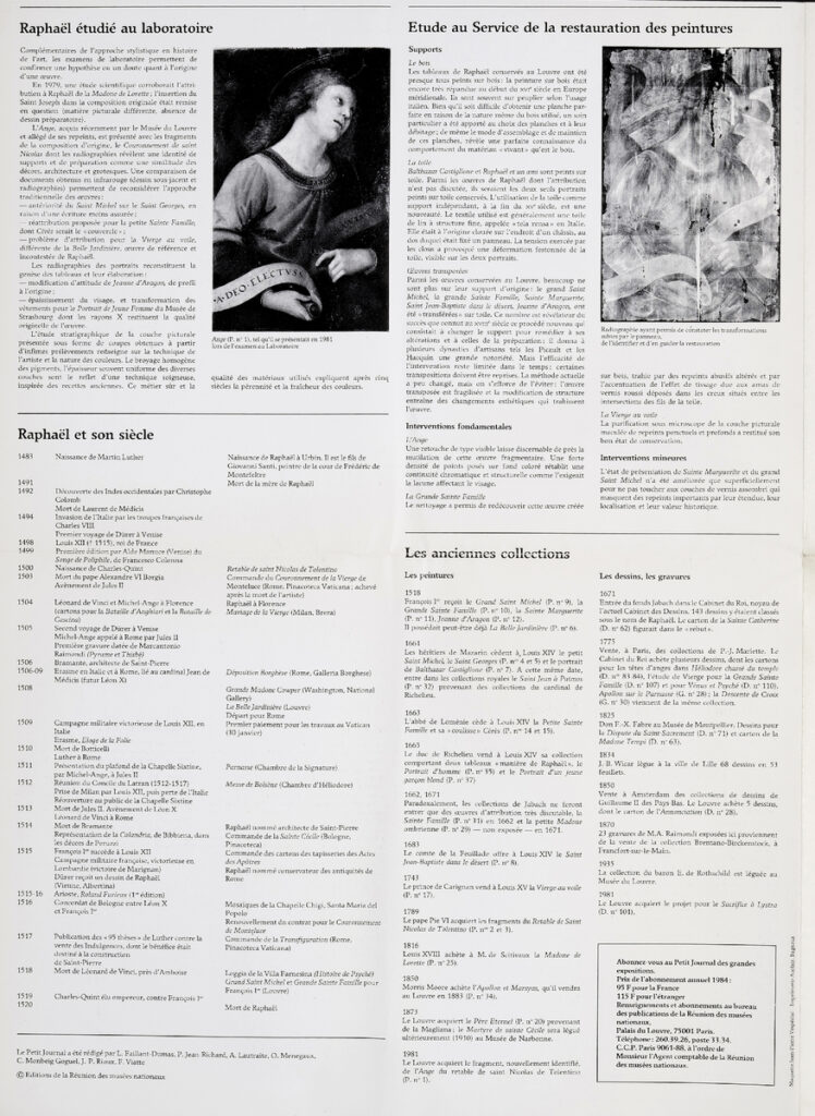 Έντυπο “Le petit journal des grandes expositions”, 16/11/1983-13/02/1984, τ. 134, έντυπο, στα γαλλικά, χαρτί ιλλουστρασιόν, δισέλιδο διπλής όψης, 45×32 εκ. Αναφέρεται σε έργα τέχνης του Ιταλού Αναγεννησιακού ζωγράφου Ραφαήλ, τα οποία ανήκουν σε γαλλικές συλλογές. Το έντυπο εικονογραφείται.