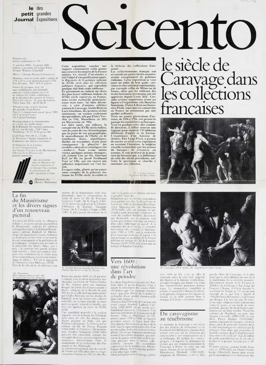 Έντυπο “Le petit journal des grandes expositions”, 11/10/1988-02/01/1989, στα γαλλικά, χαρτί ιλλουστρασιόν, διπλής όψης, 45×32 εκ. Αναφέρεται στον Ιταλό Αναγεννησιακό ζωγράφο Michelangelo Merisi da Caravaggio. Το έντυπο εικονογραφείται.