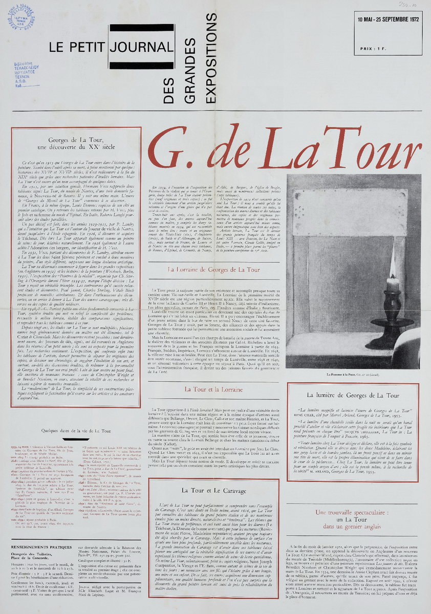 Έντυπο, στα γαλλικά, δίφυλλο (4 όψεις), χαρτί ιλουστρασιόν, 60×42 εκ., αφιερωμένο σε έκθεση έργων του Γάλλου ζωγράφου George de La Tour που πραγματοποιήθηκε στο Παρίσι το 1972.