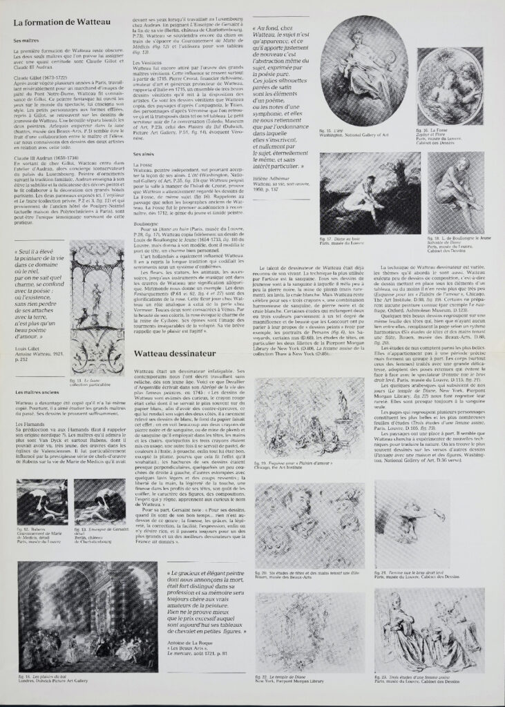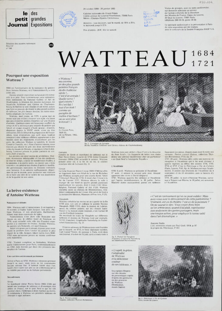 Έντυπο, στα γαλλικά, δίφυλλο (4 όψεις), χαρτί ιλουστρασιόν, 44,5×32 εκ., έκθεσης αφιερωμένης στο έργο του Γάλλου ζωγράφου Antoine Watteau. Η έκθεση διοργανώθηκε στο Παρίσι το 1984.