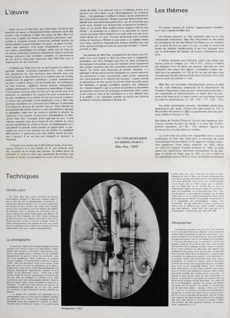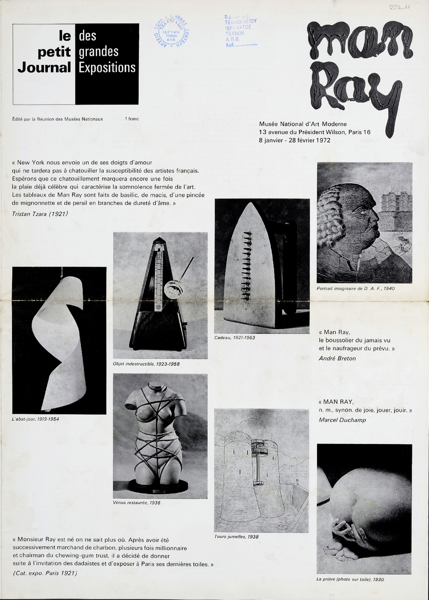 Έντυπο, στα γαλλικά, δίφυλλο (4 σελίδες), χαρτί, 44,5×32 εκ., έκθεσης αφιερωμένης στο έργο του εικαστικού καλλιτέχνη και φωτογράφου Man Ray που πραγματοποιήθηκε στο Παρίσι το 1972.