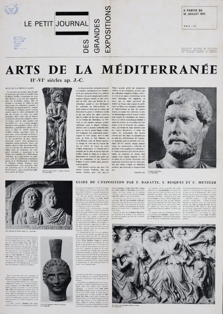 Έντυπο, στα γαλλικά, δίφυλλο (4 σελίδες), χαρτί, 60×42 εκ., αφιερωμένο σε έκθεση αρχαίας τέχνης από τον χώρο της Μεσογείου (2ος – 6ος αιώνας μ.Χ.), που πραγματοποιήθηκε στο Παρίσι το 1971. Επάνω, επιγραφή.
