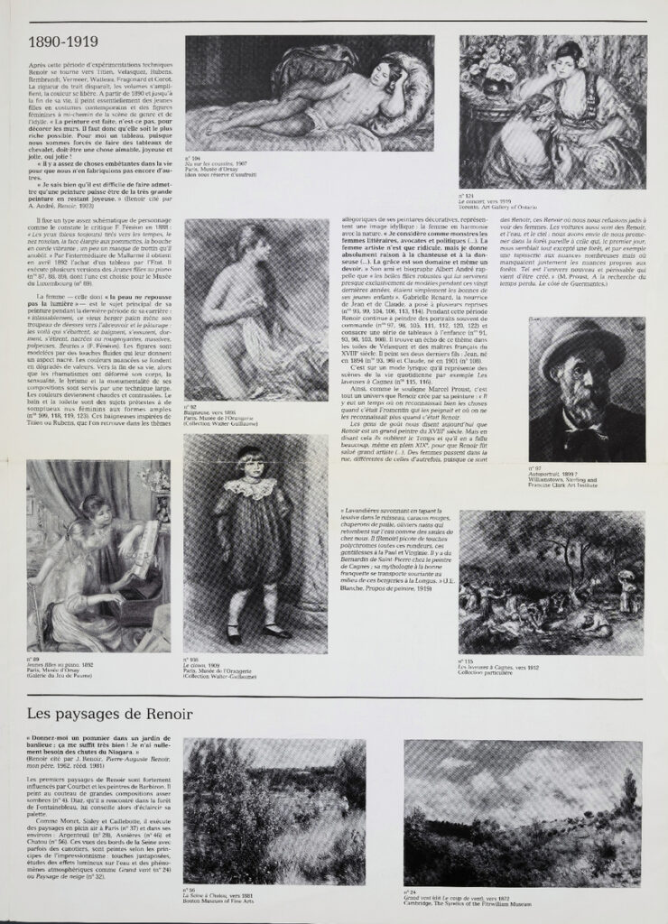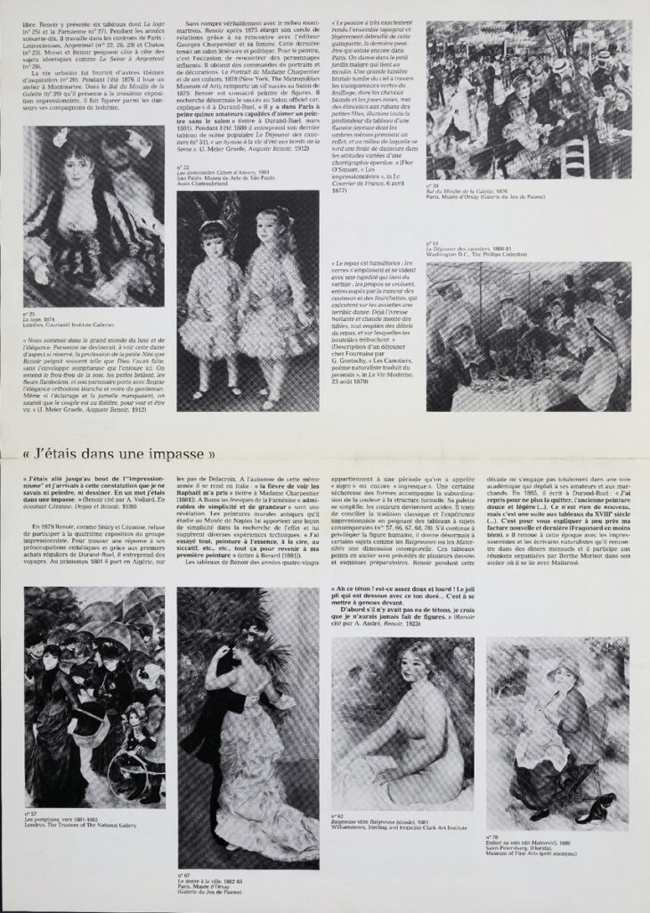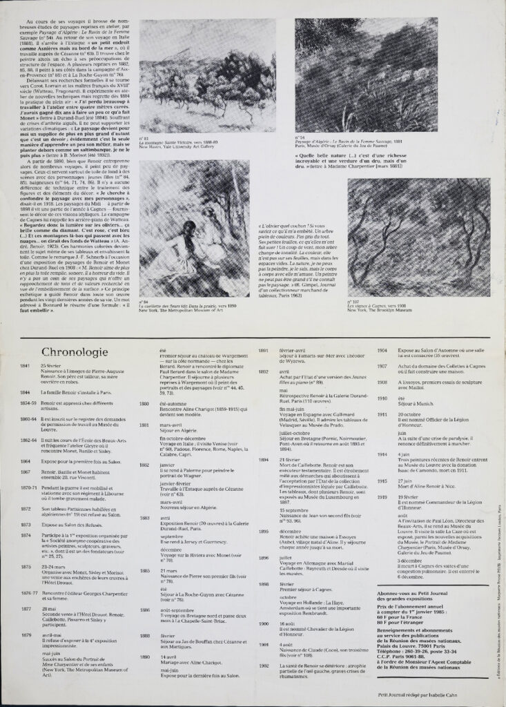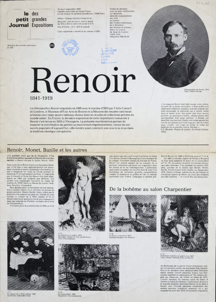 Έντυπο, στα γαλλικά, δίφυλλο (4 όψεις), χαρτί ιλουστρασιόν, 44,5×32 εκ., έκθεσης αφιερωμένης στον Γάλλο ζωγράφο Pierre-Auguste Renoir. Η έκθεση διοργανώθηκε στο Παρίσι το 1985