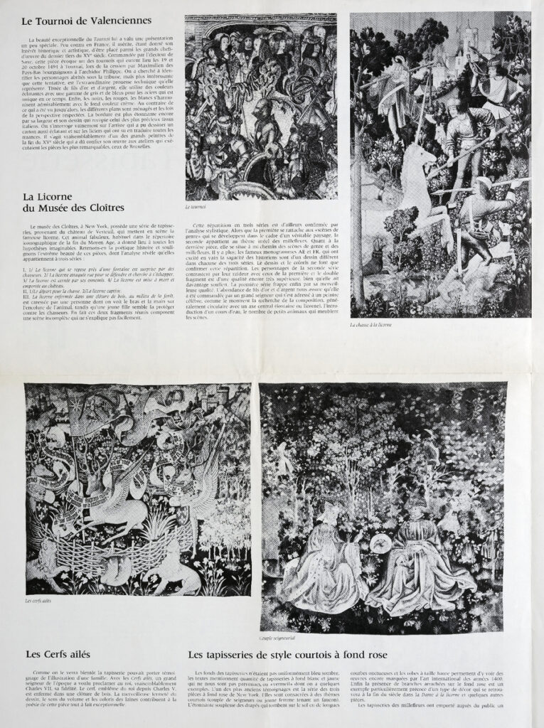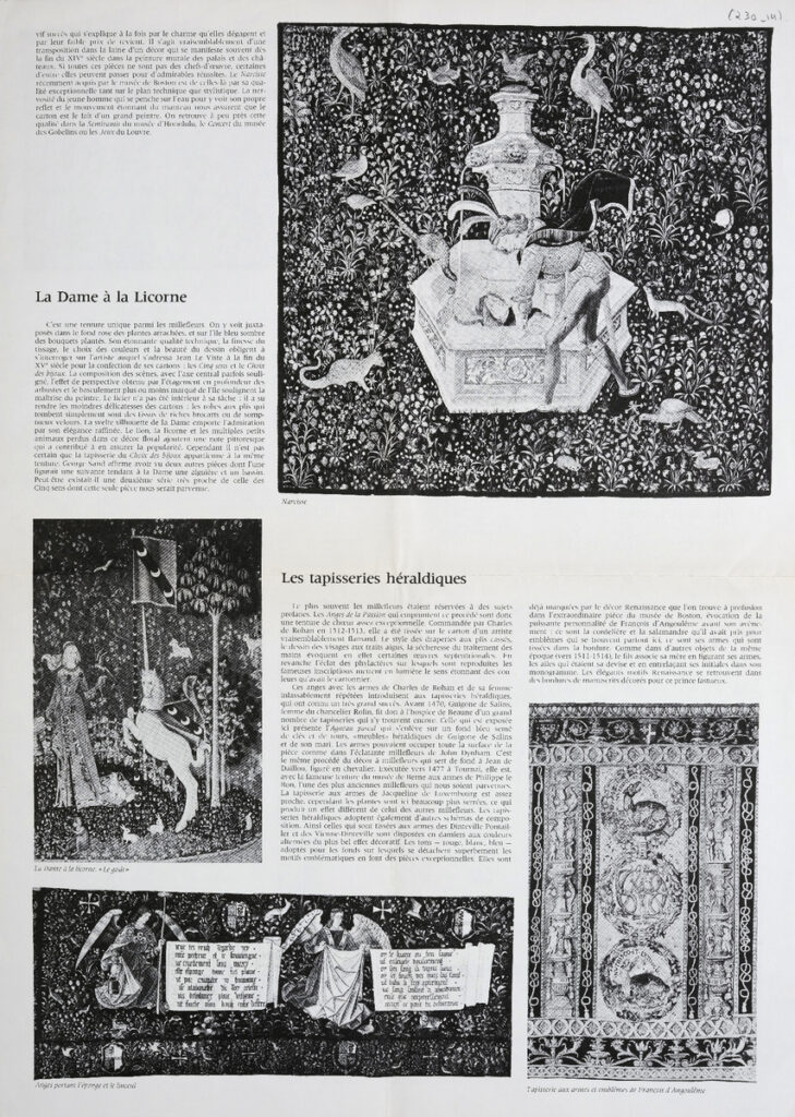 Έντυπο, στα γαλλικά, δίφυλλο (4 σελίδες), χαρτί, 44×32 εκ., αφιερωμένο σε έκθεση ταπισερί της περιόδου 14ος-16ος αιώνας που πραγματοποιήθηκε στο Παρίσι το 1974.